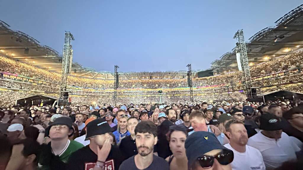 Hari-H: 16 Agustus 2025, saya bangun siang setelah mendarat di Dublin malamnya. Satu kota penuh orang memakai kaos dan merchandise Oasis membuat saya FOMO ingin beli, tapi pop-up store antreannya mengular! Dari info warlok, saya pun membeli kaos yang tinggal sisa beberapa di record store. Buru-buru saya makan nasi di restoran China demi tenaga dan minim minum demi nggak beser, lalu pulang sebentar untuk ganti baju, dan pakai pamper di dalam celana panjang gombrong biar nggak menonjol.